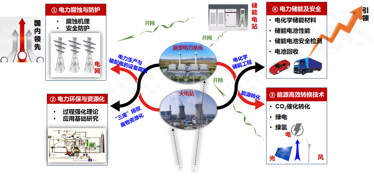 学科主要围绕“电力储能技术与安全”和“电力化学与资源化利用”两大学科方向开展工作。电力储能技术安全方向研究内容包括高能量电池关键材料、储能电池安全测控技术和退役储能/动力电池梯次利用及资源化回收技术等;电力化学与资源化利用方向研究内容包括电力设备腐蚀与防护和电厂“三废”资源化绿色处理。