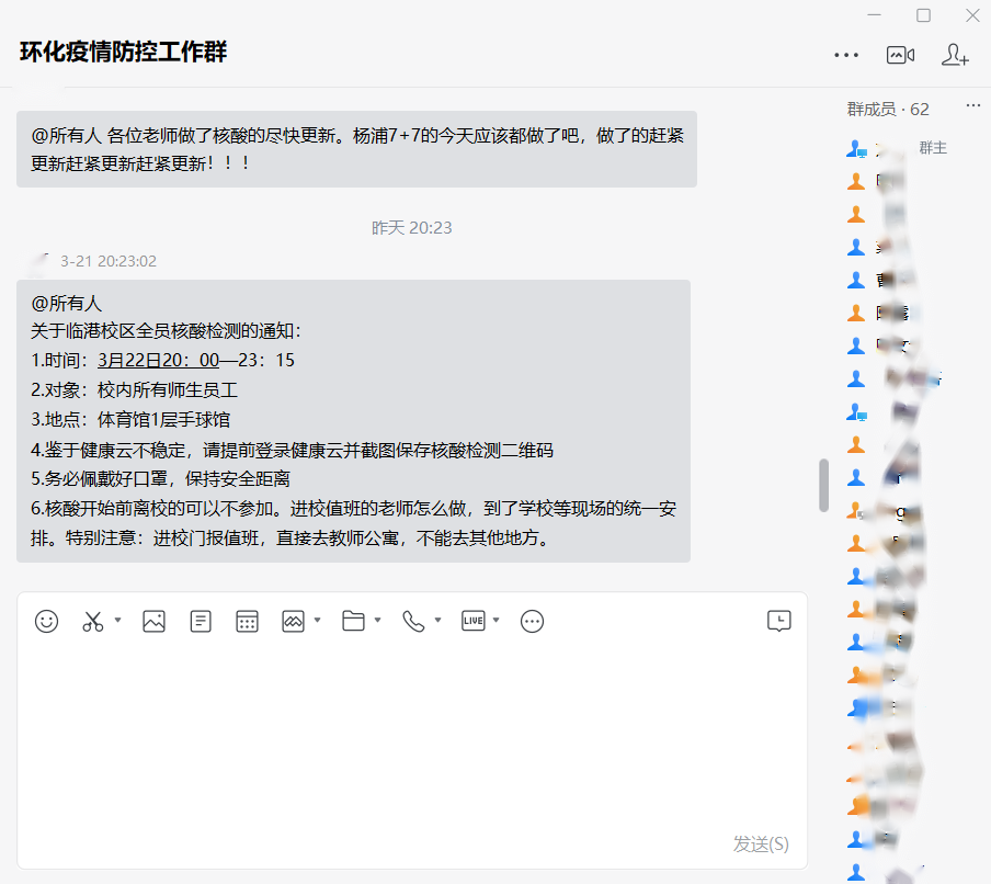 “各位老师请注意,如果有老师新做核酸或新出核酸结果,请记得及时在群内置顶表格里更新,凡涉及小区封闭等异常情况的老师也请立即上报,我们会及时跟进,谢谢!”,这是公司办公室主任刘昕老师又一次在群里发布疫情防控提醒,然后她要紧接着完成数据整理上报、防疫物资调配等诸多疫情保障的服务工作,经常会忙到通宵达旦。这样的工作只是公司在疫情期间做好服务保障的一个缩影,公司全体行政管理教师在疫情期间也都在坚守自己的岗位,全力为公司师生做好疫情防控期间的服务保障工作。