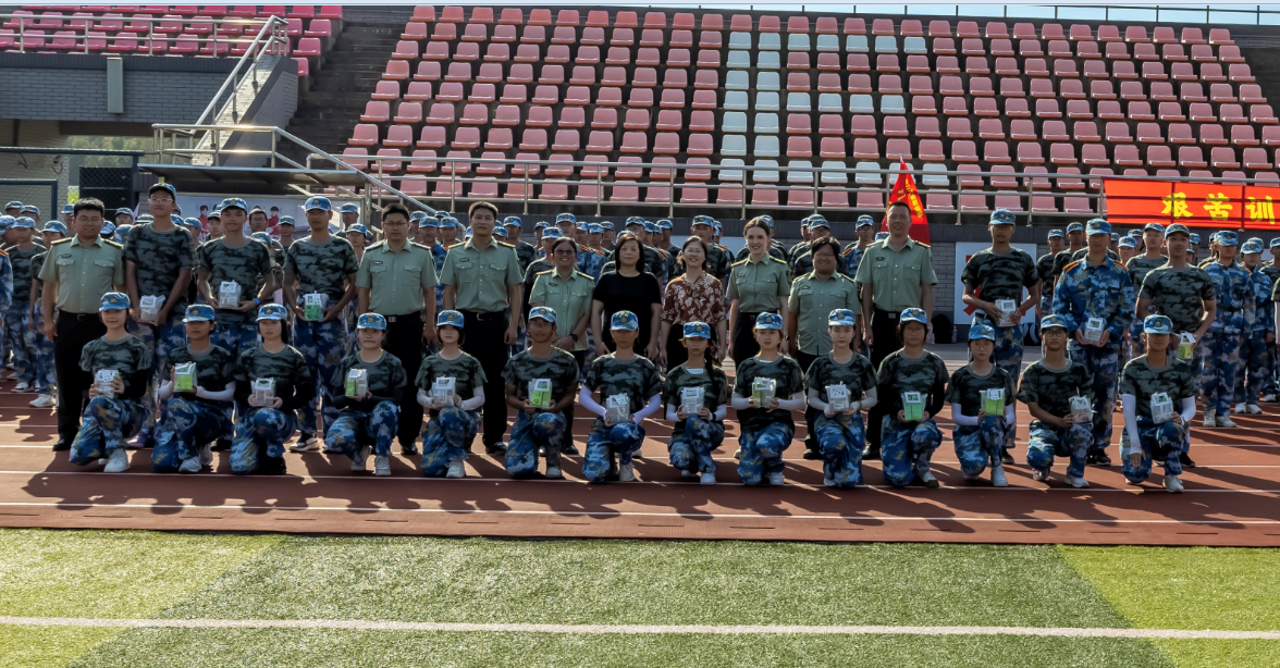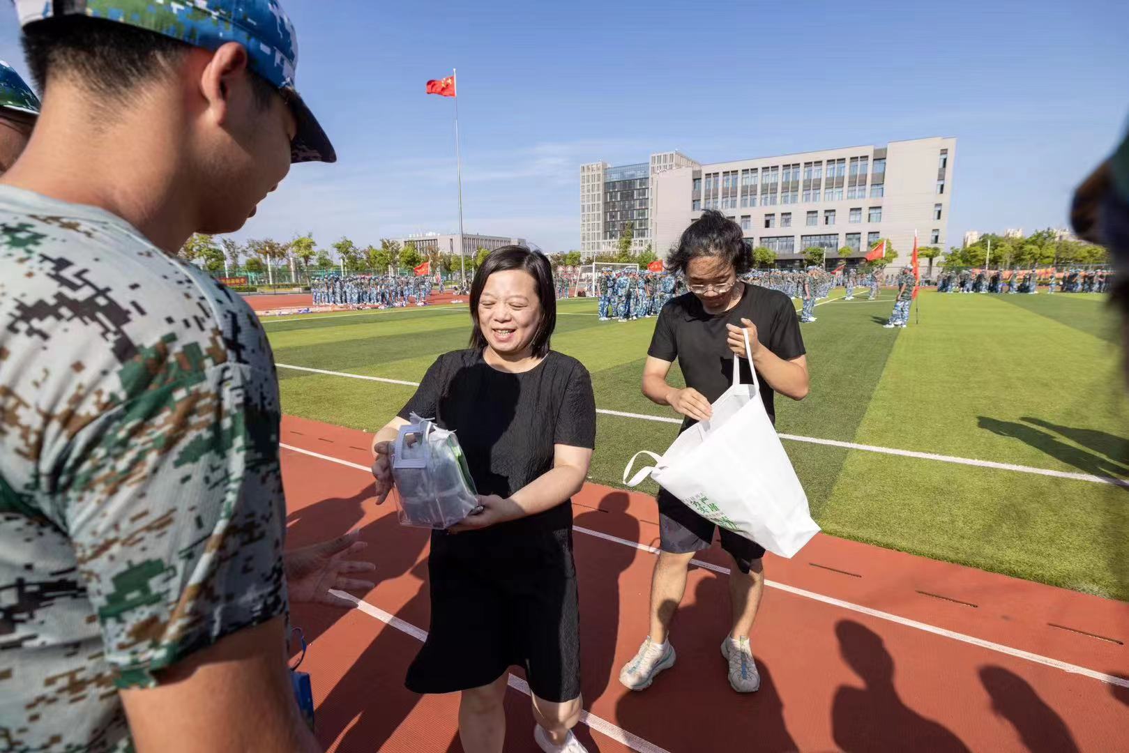 随后,为鼓舞公司学子军训的志气,陶莹、涂莹亮代表公司向教官和同学们发放慰问品,为同学们在炎热的天气中带来一份清凉。