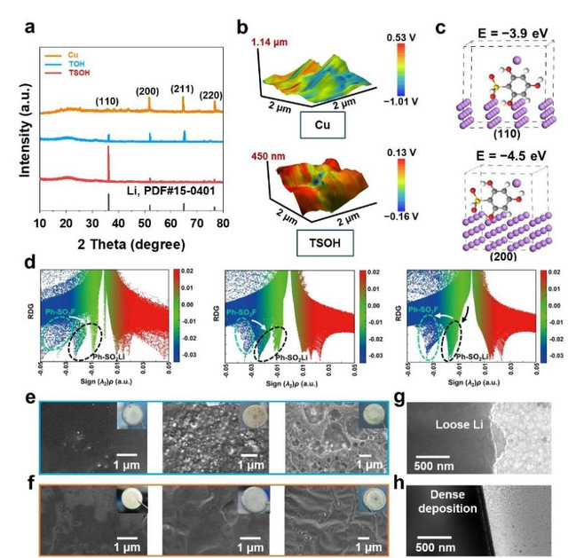 图2、(a) 在−30 oC用不同基材锂电镀/剥离后的XRD图谱。(b) 不同基体中镀锂后负极表面的电位分布和高度变化。(c) 有机活性层在 (110) 和 (200) 晶面上的吸附能量。(d) 电荷密度梯度系图。不同温度下锂沉积的SEM图像,(e) 铜,(f) 有机活性层。(g) 、(h)不同界面的低温TEM图像。