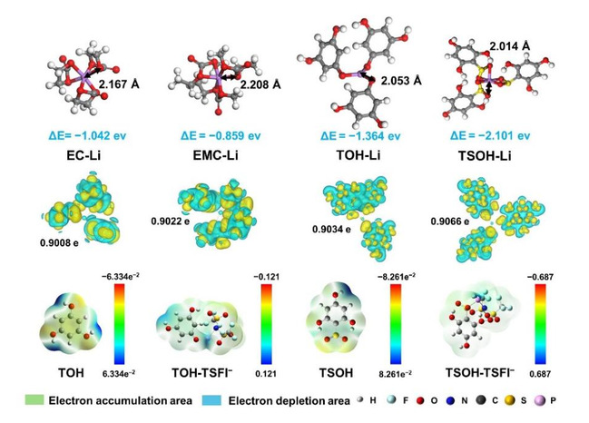 通过DFT计算比较了不同化学组分与锂离子的配位距离和相应的巴德电荷转移,证明了2,4,6-三羟基苯磺酰氟对锂离子独特的结合能力,有利于负极/电解液界面的锂离子转移和成核,这种优势即使是在低温下(−60 oC)也得到了保持。