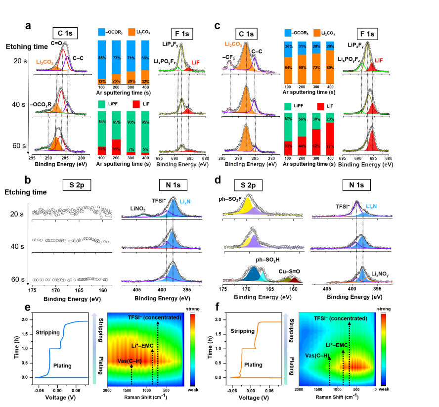 图3、通过氩离子溅射的XPS光谱分析了不同SEI的界面化学组分,(a, b) 铜。(c, d) 有机活性层。负极/电解质界面反应的原位拉曼测试。