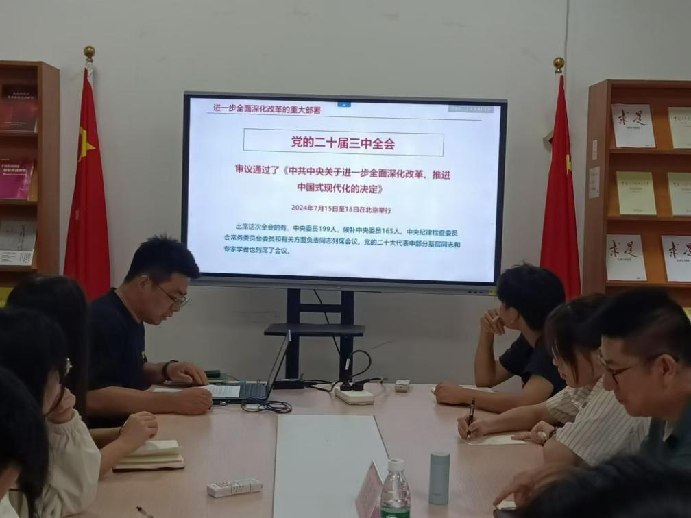 支部书记王涛带领支部成员就《中共中央关于进一步全面深化改革、推进中国式现代化的决定》展开了深入地学习,会上着重强调了改革开放后历次党的三中全会的主要议题与成果。分别按照推进中国式现代化对进一步全面深化改革提出新要求、推进中国式现代化的重大部署、为中国式现代化注入新动能、在发展中保障和改善民生等四个方面进行解读。党的二十届三中全会是以习近平同志为核心的党中央在以中国式现代化全面推进强国建设、民族复兴伟业的关键时期召开的一次极为重要的会议。全会审议通过的《决定》,紧紧围绕推进中国式现代化这一中心任务,对进一步全面深化改革作出系统部署,是站在新的历史起点上推动全面深化改革向广度和深度进军的总动员,是指引新征程改革开放的重要纲领性文件,对于确保实现党的二十大确定的战略任务、全面建成社会主义现代化强国、实现第二个百年奋斗目标,具有重大而深远的意义。