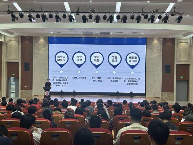 大会围绕“就业指导”与“就业动员”两大主题展开。在就业指导环节,闵宇霖对当前经济形势和就业形势进行了深入剖析,为同学们明确努力方向。他鼓励同学们要有清晰的职业规划,提前为未来打算,切不可眼高手低、好高骛远,亦不能漫不经心。同时,闵宇霖还针对研究生毕业论文撰写提出了宝贵的建议。