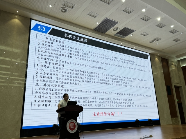 邬腾飞以毕业班辅导员的视角,就学风建设与学业梳理、就业去向确定、考研准备、毕业设计、毕业事项提醒及预防求职诈骗等方面进行了详细的实务培训。针对网签流程、三方协议签订、毕业去向录入、就业推荐表制作、员工档案去向等同学们关心的问题逐一讲解,并勉励大家要提早规划,事事做在前面,以应对未来的挑战。并勉励大家凡事提前着手,方能事事自如。