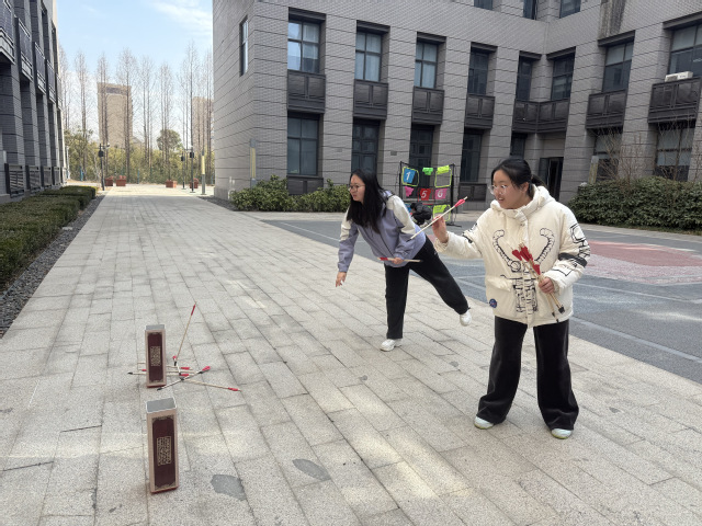 本次活动分为投壶、飞盘、滚动水瓶三个项目。在投壶区,各个参赛同学摩拳擦掌、跃跃欲试。志愿者同学宣布比赛规则和流程后,只听一声令下,参赛者屏气凝神,全身贯注瞄准投掷,大家都在全力以赴,表现出不凡的实力。参加滚动水瓶的同学锚准位置,轻轻用力滚动瓶子,一举得分。参加飞盘比赛的老师和同学们先在运动场地进行热身,在正式进入比赛后,他们随即向空中抛起飞盘,飞盘在空中飞舞,这一个扔得远一些,那一个扔得近一些,整个比赛热闹而激烈,参赛导师和同学们个个情绪高涨,全心投入。