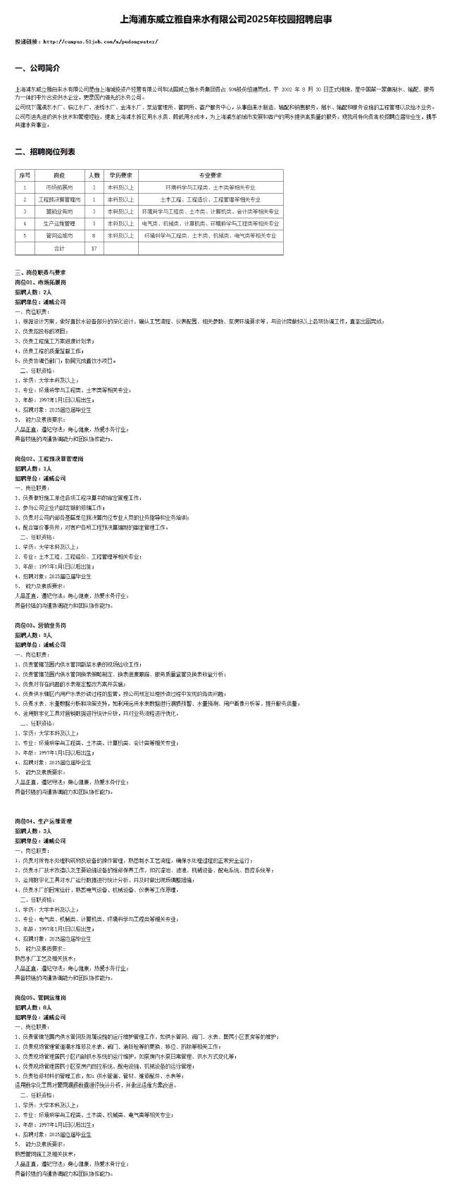 院2025届就业信息【64】——上海浦东威立雅自来水有限公司